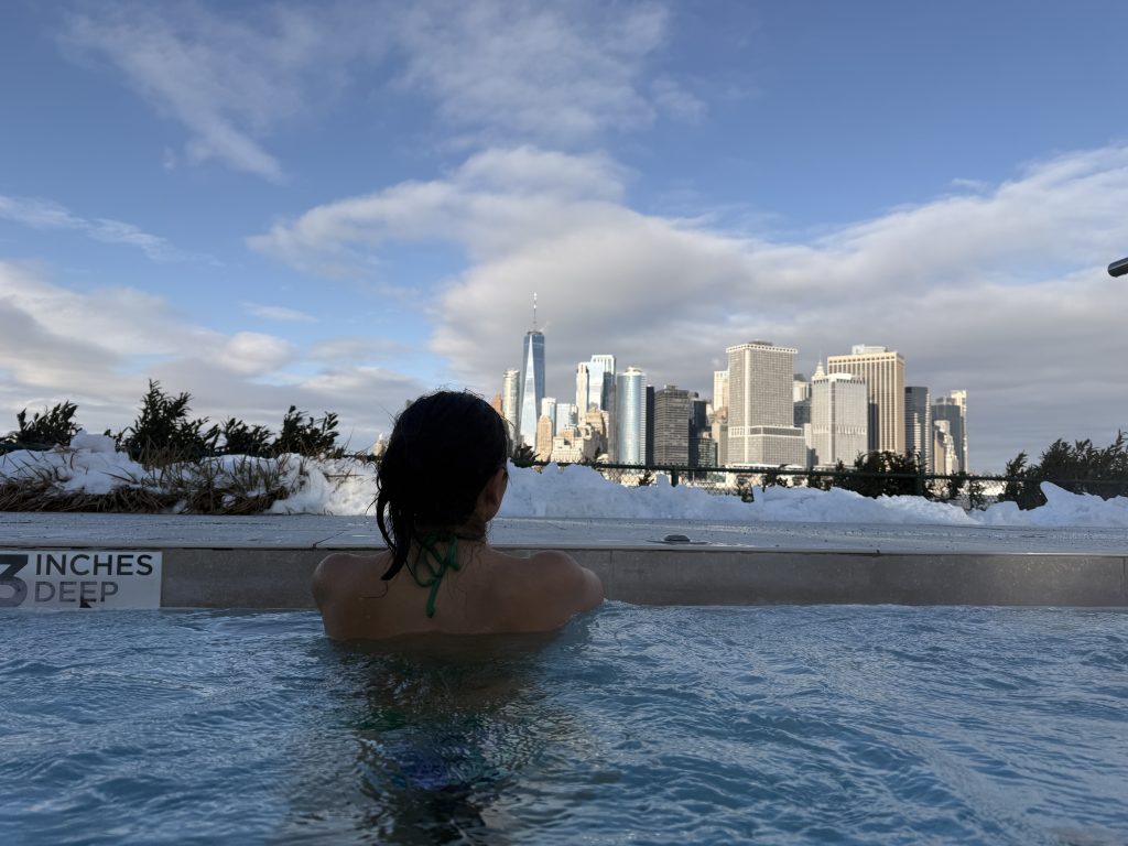 Pero también te sentí en el contraste: esa tarde en el QC Spa de Governors Island, entrando a la piscina outdoor con las toallas congeladas, mientras Manhattan brillaba al frente, tan imponente, tan grande.